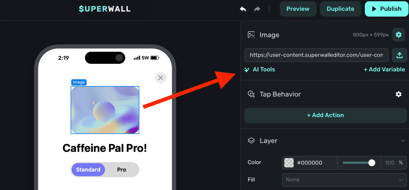 - Custom Action: Performs a custom action that you specify. Using custom actions, you can tie application logic to anything tapped or clicked on your paywall. Check out the docs here.