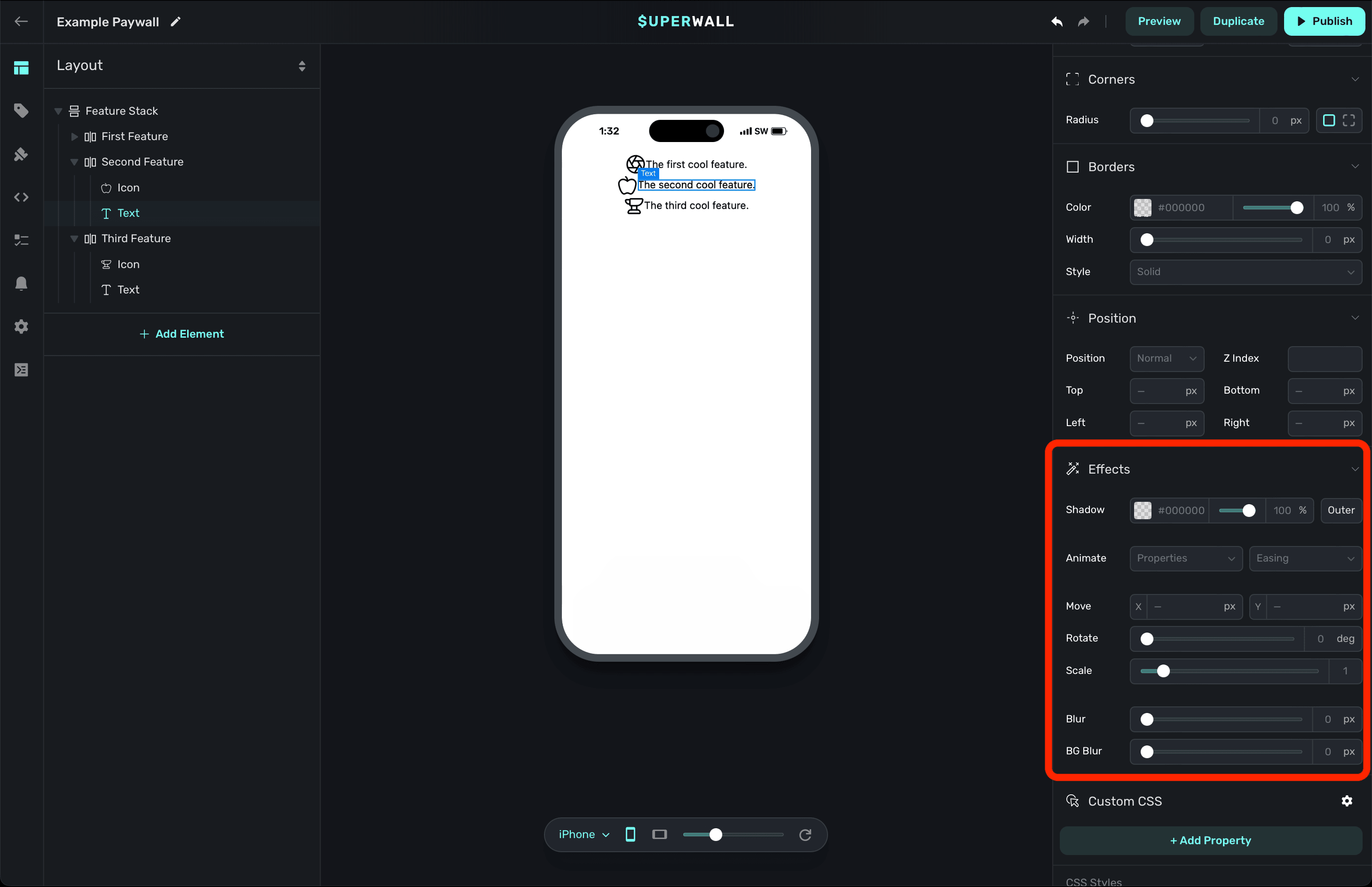 The properties below are editable regardless of which kind of component you are editing. The most important thing to keep in mind is that all of the properties below will work the same as they would on a web page. When you change these properties, behind the scenes — Superwall is applying the corresponding CSS code to the paywall.