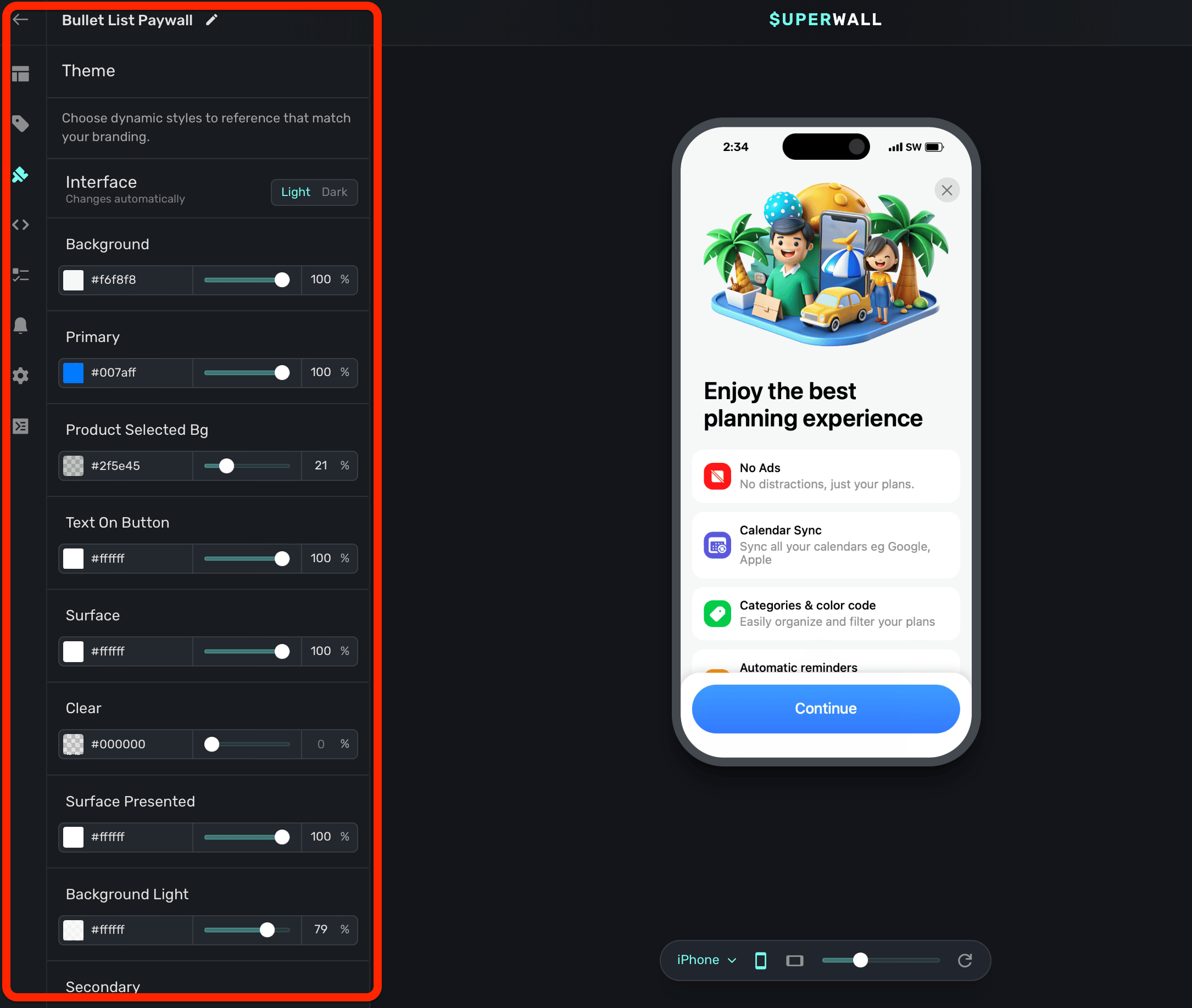 Superwall will copy all of your theme values over to the dark interface style, and from there you can customize them specifically for dark mode.