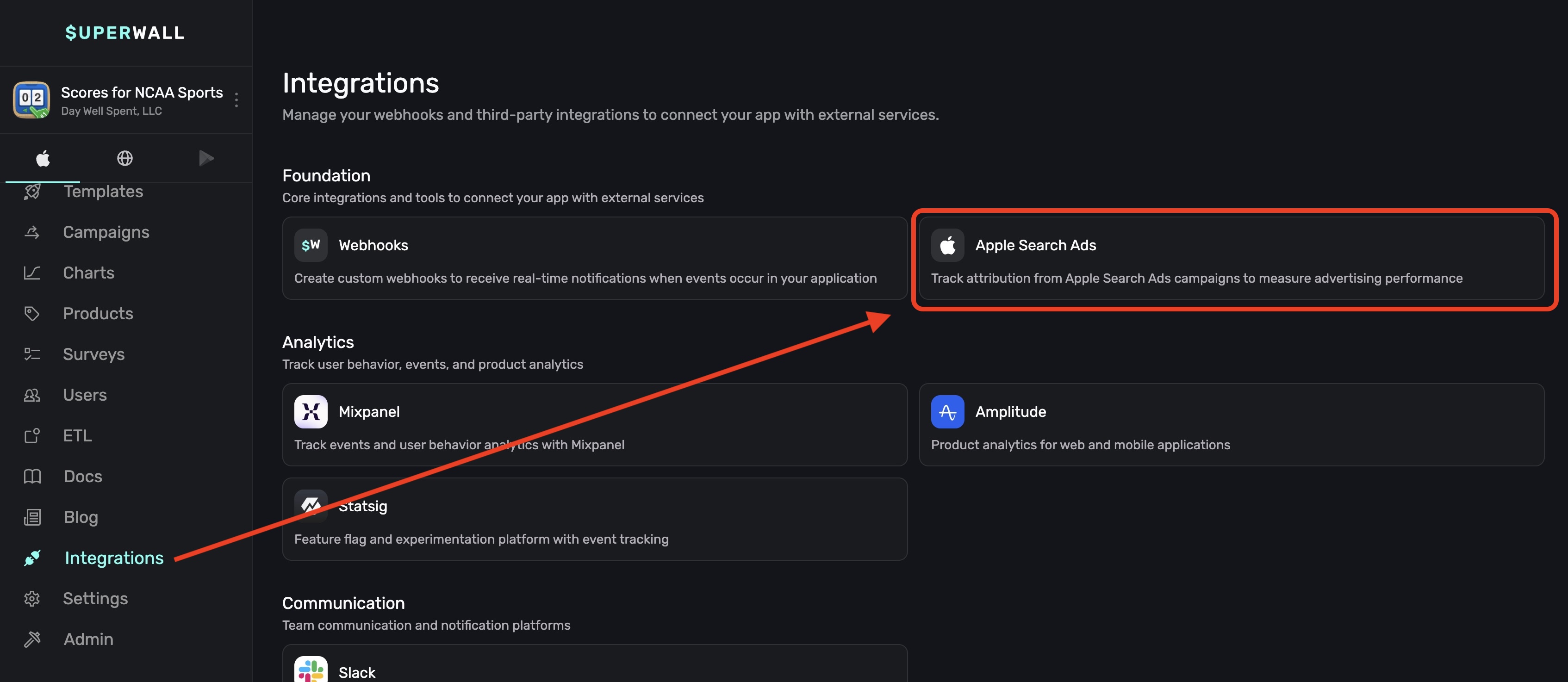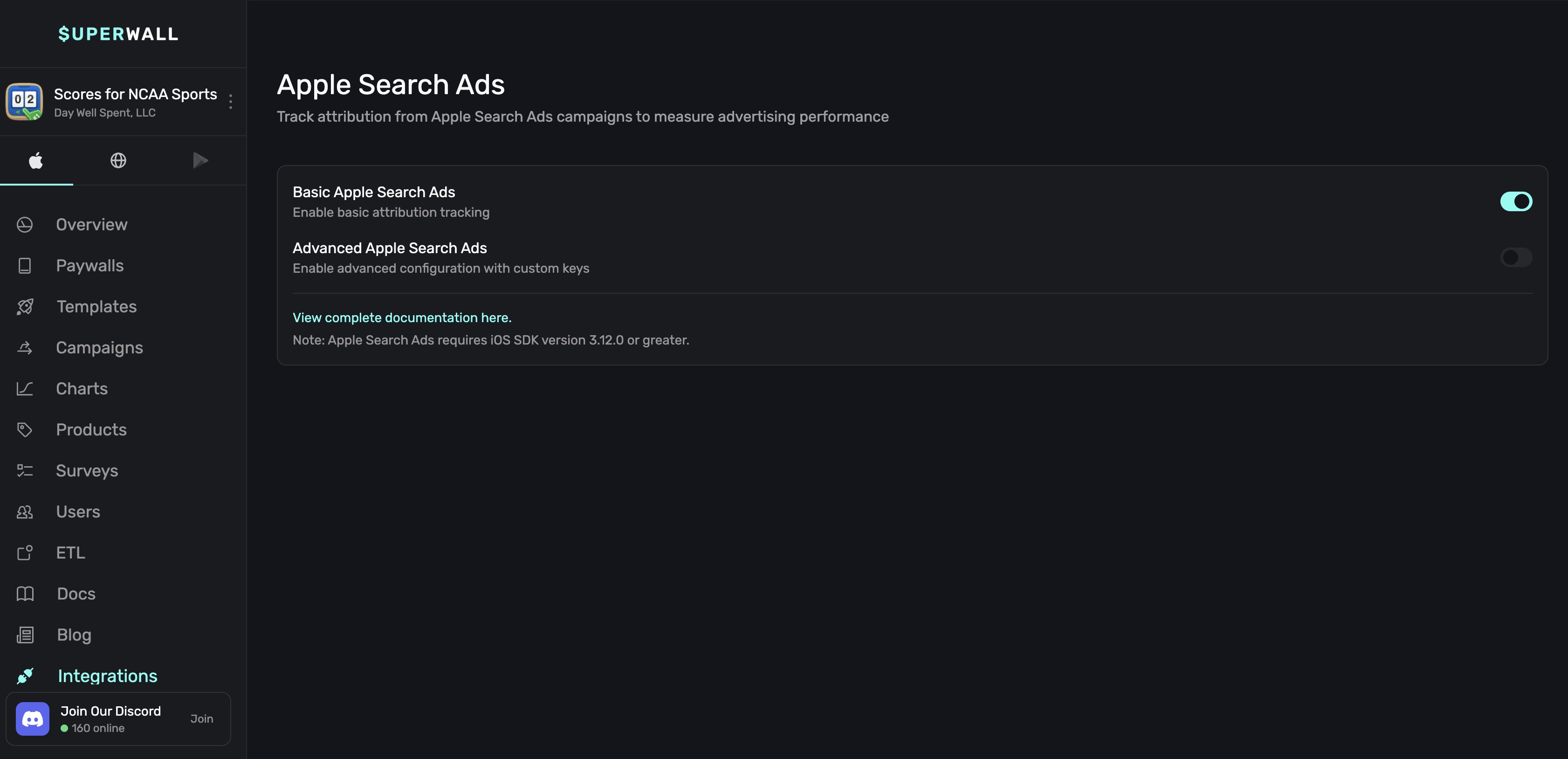 In the Apple Search Ads section within Integrations, you can the enable Apple Search Ads integration with Superwall: